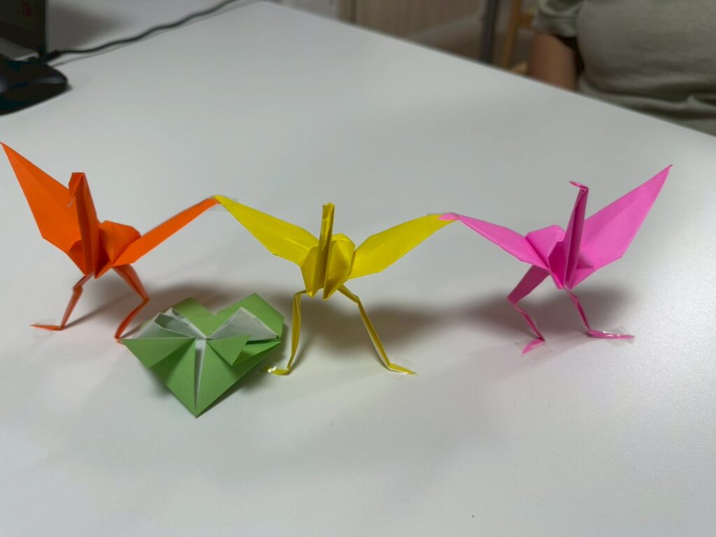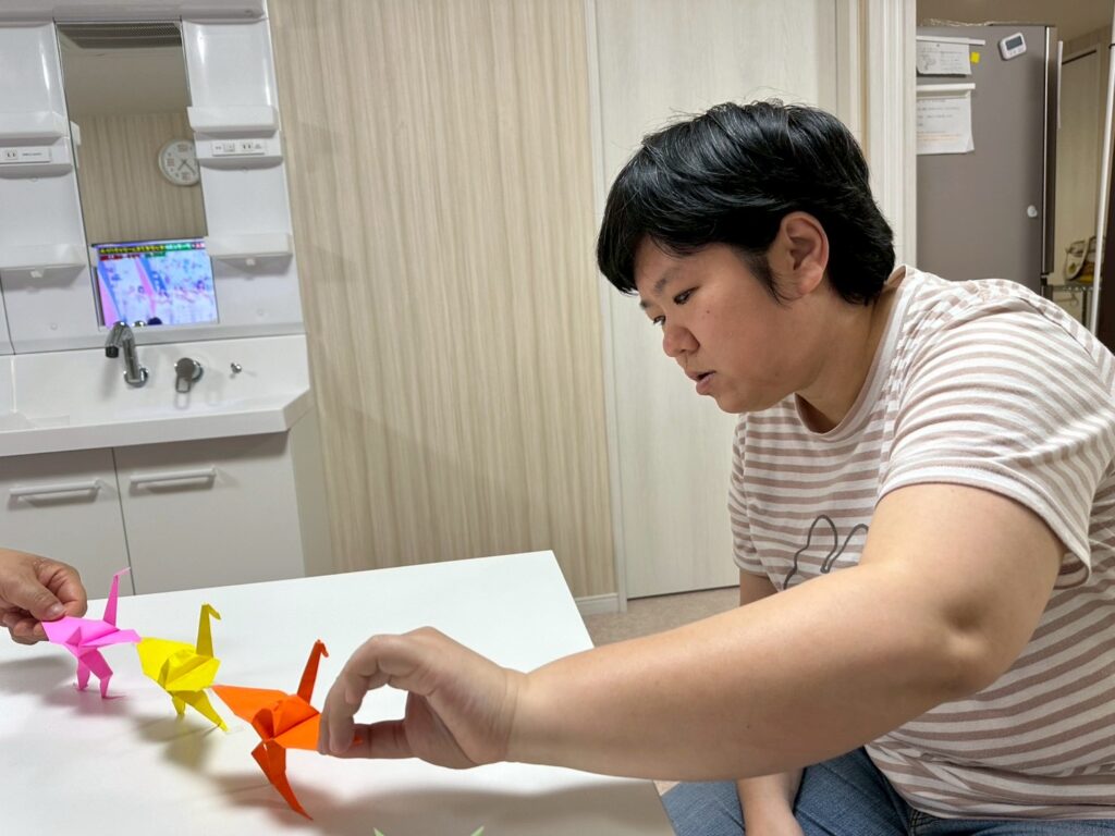 この日は手先が器用な職員がご利用者様にダンシング鶴を折る事を提案してくれたようです。
