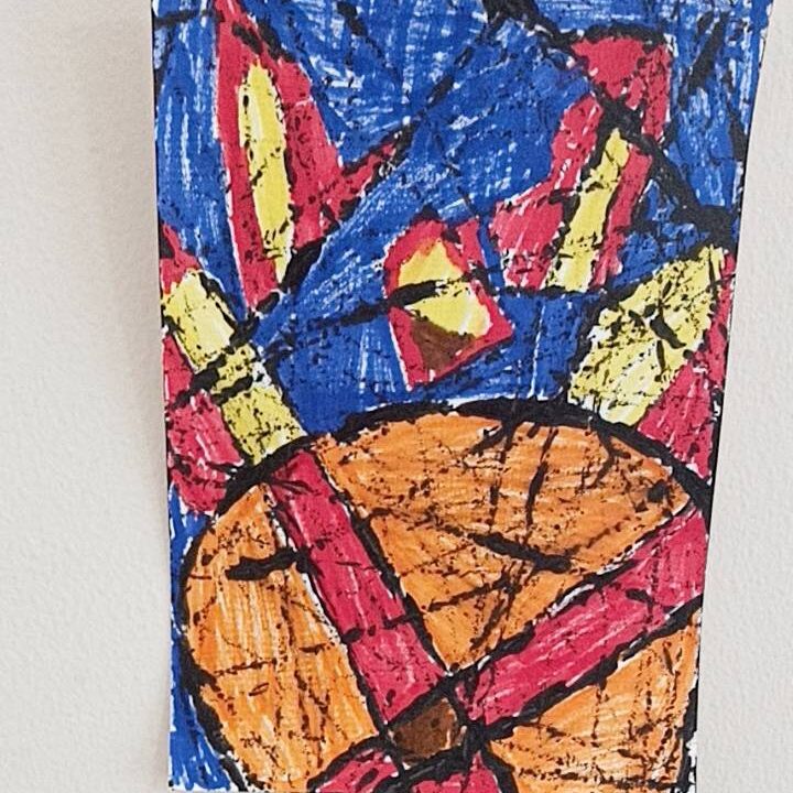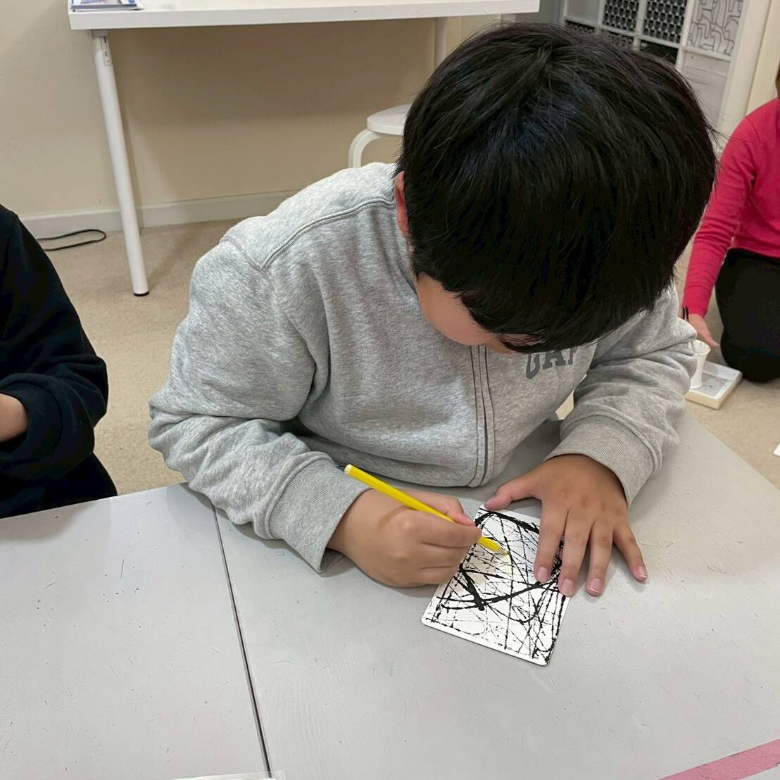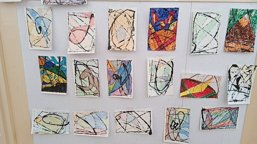 墨汁をつけたビー玉をポストカードの上をコロコロ転がすと。。。幾何学模様が完成!! それが何に見えるのか。。。何に見立てるかはその人次第!!