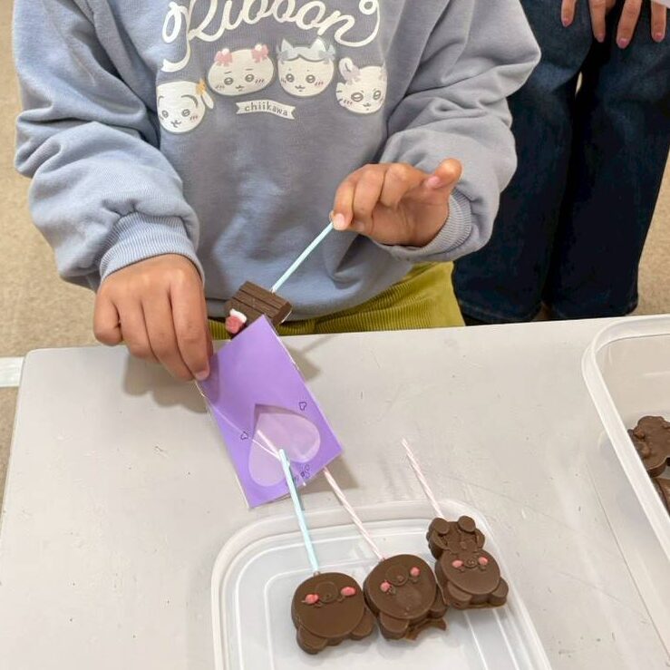 みんな「ママにあげたいな~♡」「パパにもあげよ~かな。。。」と とても嬉しそうにお友だちとかわいいチョコレートを作り、自分たちでラッピングもしました。