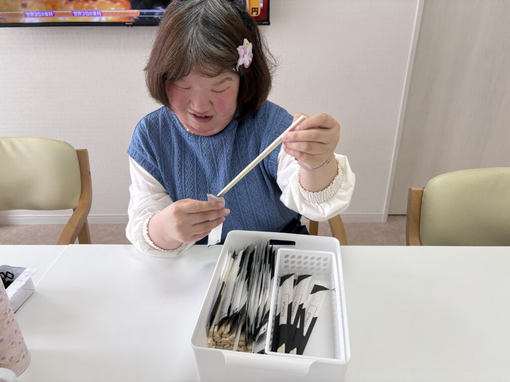 次は割り箸を袋に入れる作業です!!