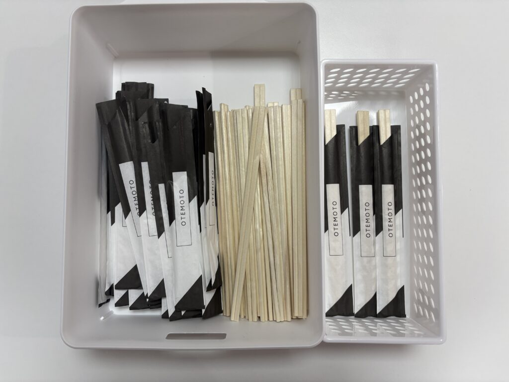 左の大きいボックスの割り箸を袋に詰めて右の小さいボックスに入れてもらいます(^▽^)