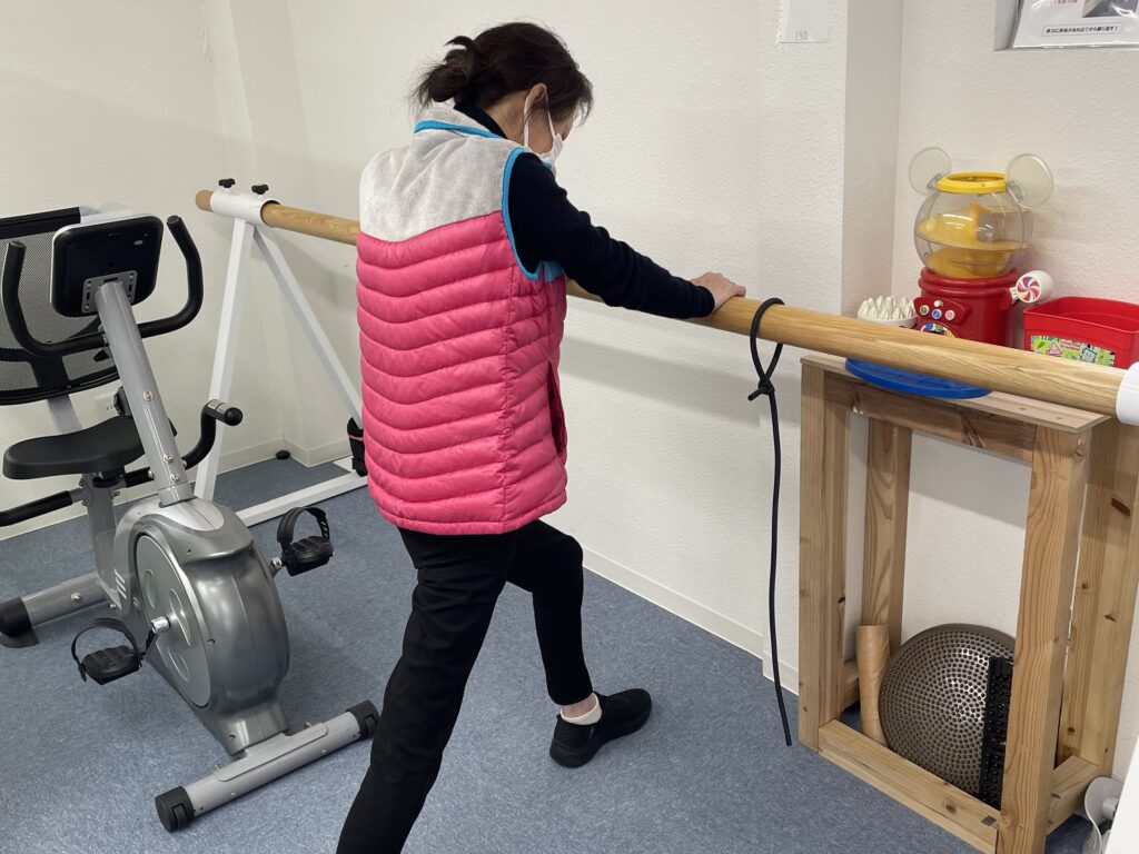 一人で出来る方には機能訓練指導員が作成した自主トレメニューをもとに平行棒での運動やゴムチューブを使った運動を行っていただいています。その際、支援員がついて教えながらすることもあります。
